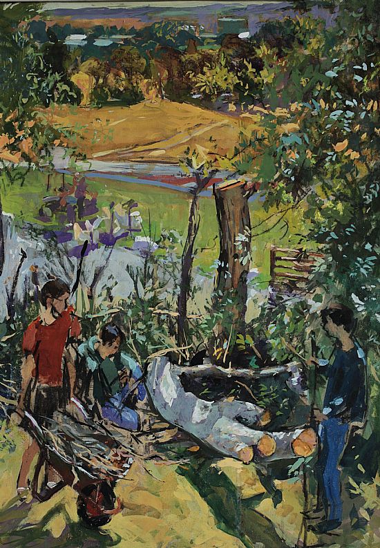 clearing up after tree felling 30"x24" Gouache charcoal and chalk on watercolour paper